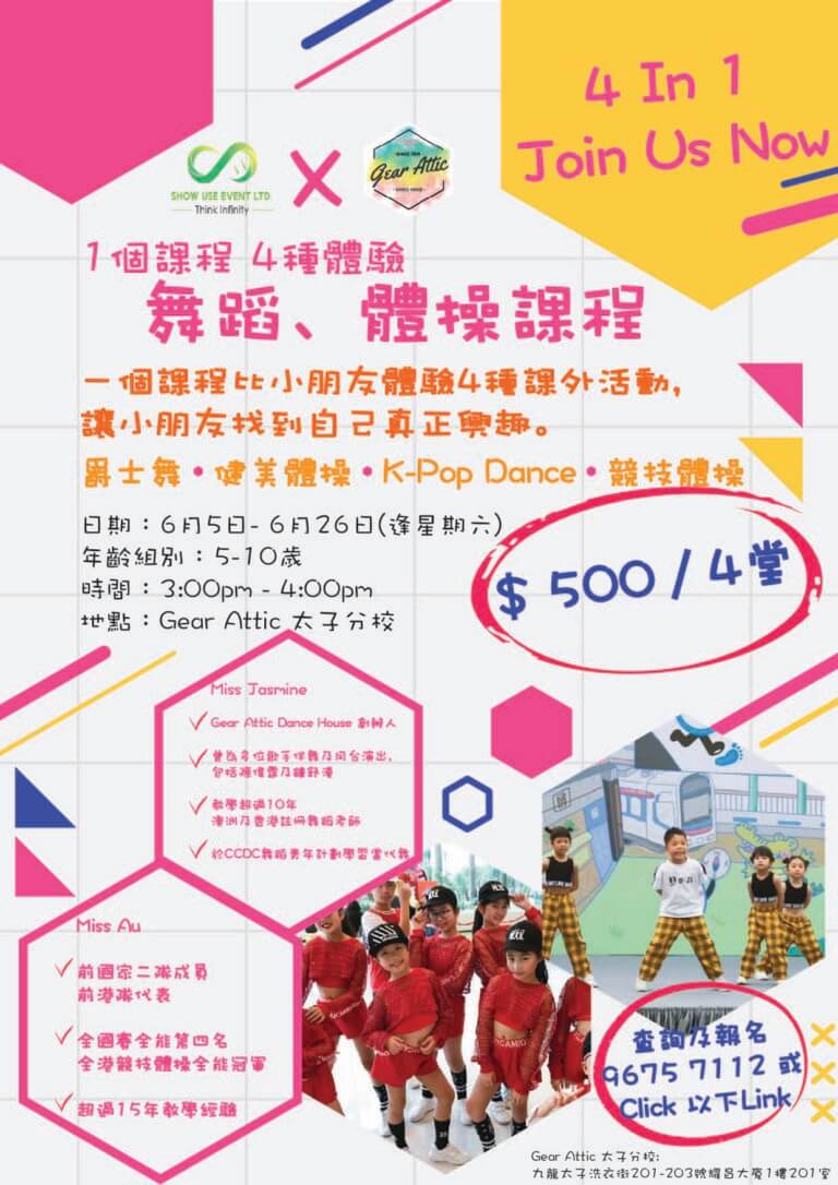1 個課程4 種體驗 ,唔知小朋友中意咩野課外活動? 怕小朋友3 分鐘熱度?今次我地舉辦嘅4 In 1 舞蹈、 體操課程一定啱曬你地😉Gear Attic  聯乘 Show Use Event 舉辦的4 In 1 舞蹈、體操體驗課程以輕鬆的教學形式教授小朋友4 種不同運動及舞蹈的基本功, 讓小朋友尋找自己有興趣的範疇,同時亦可訓練小朋友平衡力及身體靈活性!幫助大腦開發,手眼協調及肌肉發展等體驗包括:爵士舞、 Kpop Dance、健美體操、競技體操